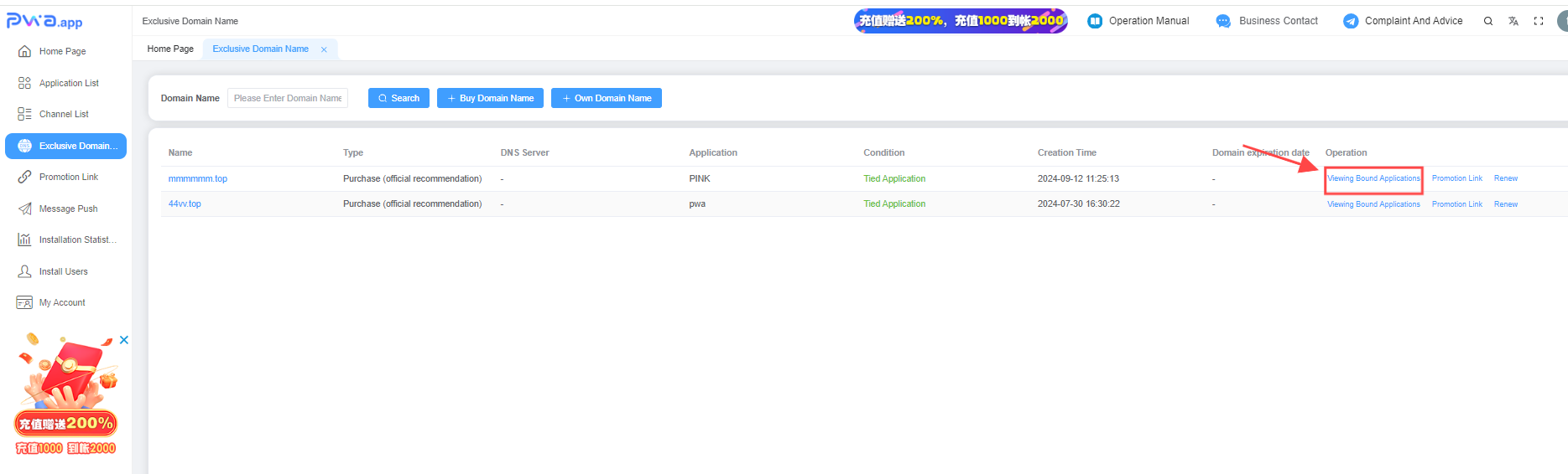 Find Create link in the promotion link column of the jump, select the application of the binding domain name, and there will be a domain name for selection.